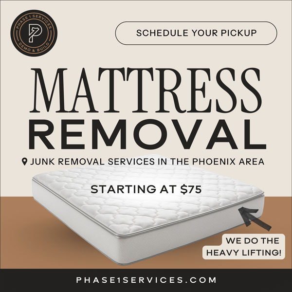Phase 1 Services offers mattress pickup and disposal to the greater Phoenix Arizona and often has openings for next day pickup. Contact Phase 1 today for a junk removal estimate. Whether it’s a single mattress, a box spring, or a 1/4, 1/2, or full trailer load, Phase 1 Services can help.